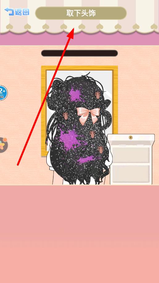 3、完成污垢清理后,点击上方“取下头饰”提示区域,操作取下客人头发上的装饰,为后续美容步骤做准备。