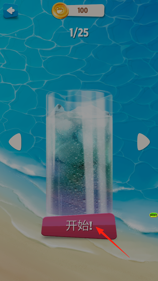 1、进入手机饮酒模拟器,看到装有冰块的玻璃杯与开始按钮,点击按钮开启饮料制作挑战,进入操作流程,通过开始操作,体验饮料制作的基础玩法,感受关卡启动的互动。