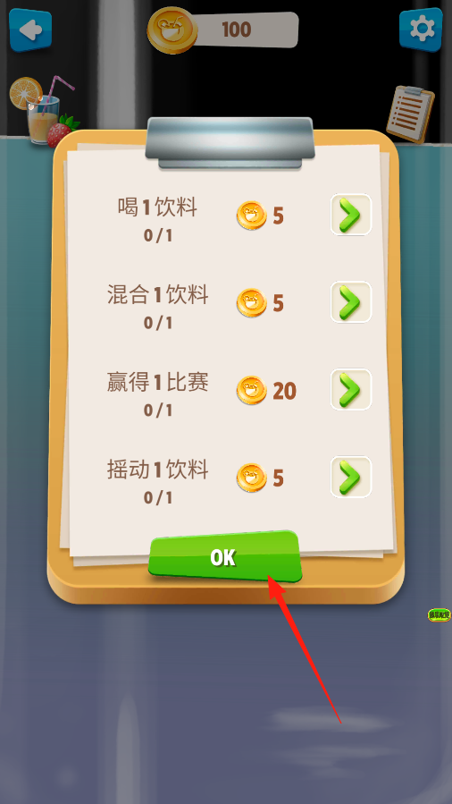 2、在任务界面,查看喝1饮料和混合1饮料等任务列表,点击OK按钮,确认任务并开始执行,利用任务机制,推进游戏进程,体验任务驱动的玩法,感受目标指引的乐趣。