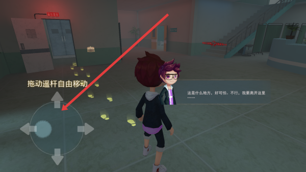 1、游戏一开局要用摇杆移动角色,跟随引导熟悉操作,按提示逃离初始区域,留意场景发光道具。