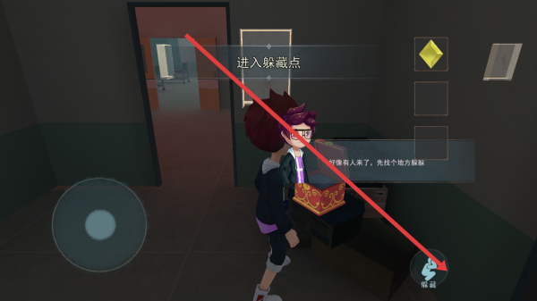 2、听到好像有人来,速找进入躲藏点的标识,点击右下角的躲藏按钮,点击互动后藏进箱子、百叶窗后躲怪物。