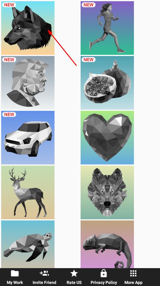 1、进入界面选带NEW标识图案,如狼头等,点击即可开启对应多边形拼图挑战,开启创意拼接流程。