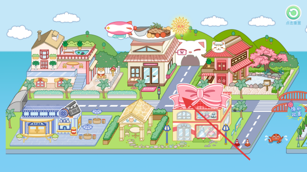 1、游戏初始界面,点击带有粉色蝴蝶结的建筑等场景元素,进入相应建筑开启游戏体验。