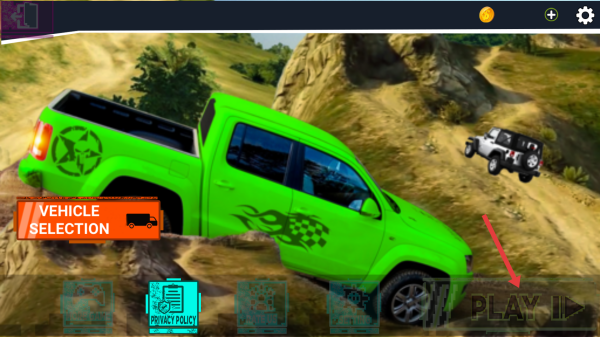 1、在车辆选择界面点击PLAY按钮,选定越野车后进入山地场景的竞速关卡,开启越野挑战。