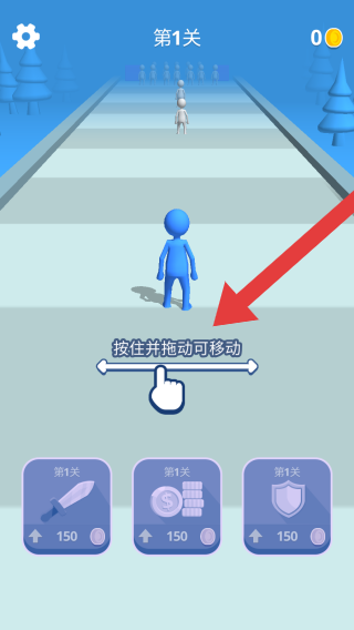 1、显示第1关,操作提示按住并拖动可移动,属于玩家操控蓝色小人在关卡中移动、战斗,通过收集资源升级道具的玩法。