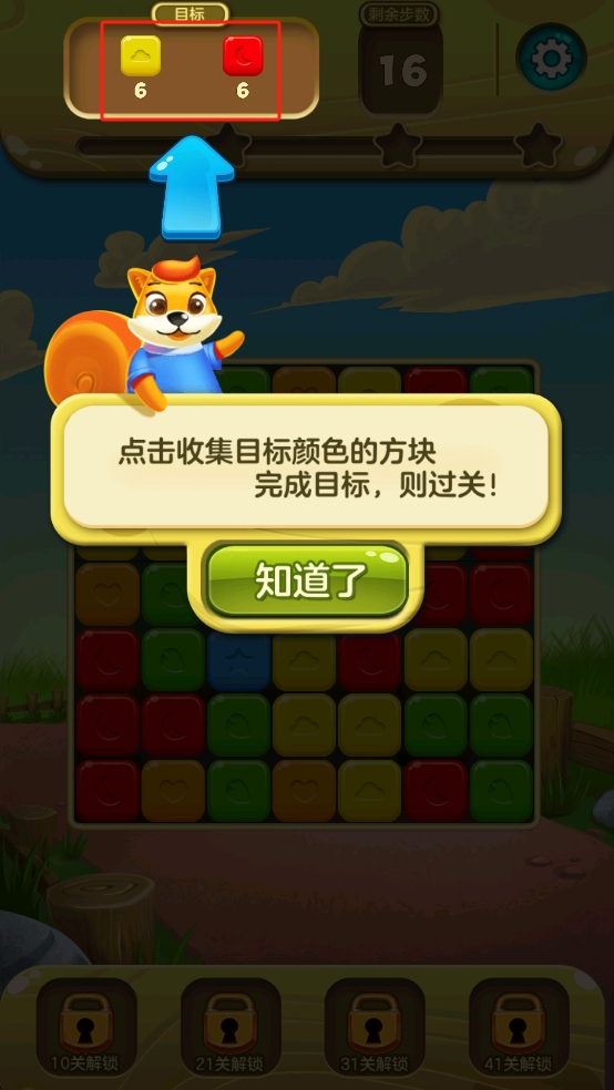 1、查看提示可以看到本关需在16步内收集6个黄方块与6个红方块,优先瞄准同色方块集群点击,通过连消高效推进目标进度 。
