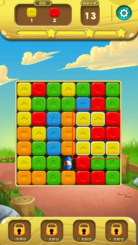 2、游戏中聚焦红色框内的黄色方块连片区,点击触发消除,同时兼顾红色方块分布,利用剩余13步,借助方块连消特效。