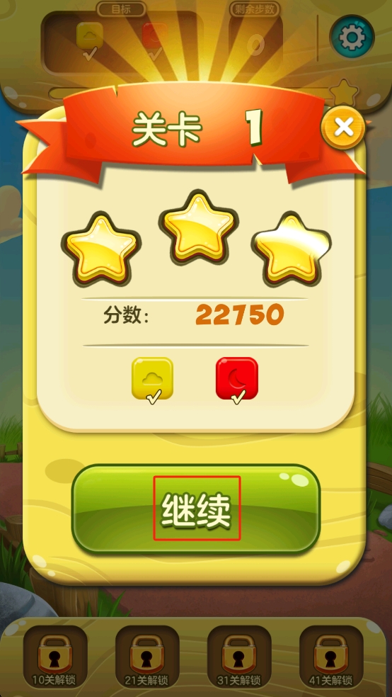 3、关卡1达成目标后,界面展示三星评价与分数22750 ,点击绿色继续按钮,可进入下一关应对新的方块收集挑战。