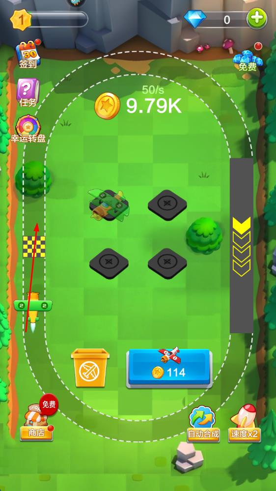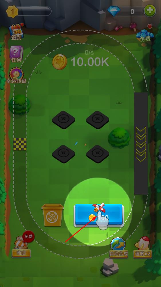 1、开局先购买飞机,数量越多越易获得彩色飞机,将两个相同飞机合成新机型,再把合成后的飞机放到跑道上,使其滑行赚钱。