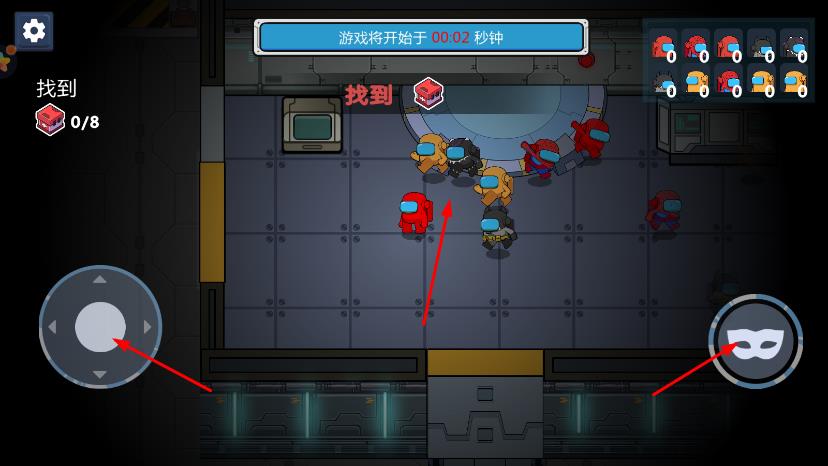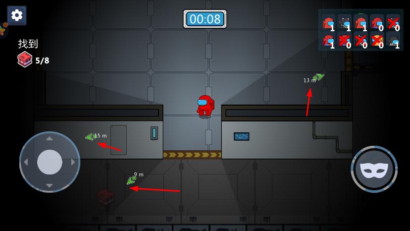 2、用左侧摇杆控制红色角色移动,右侧面具按钮可能用于隐藏或特殊技能,在场景中寻找目标,如红色箱子