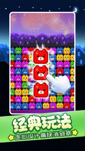 1、游戏采用经典三消核心玩法,以圆润可爱的熊熊方块作为主要元素,玩家只需点击相邻的同色方块即可完成消除操作,简单直观易上手。