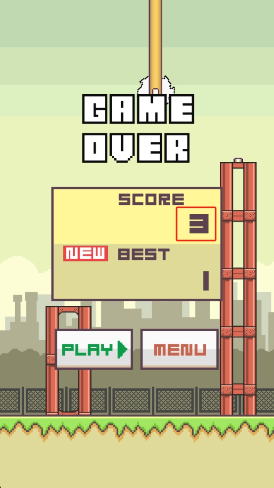 3、若跳跃失利,界面就会显示GAME OVER与得分3,点击绿色PLAY按钮即可重新发起挑战。
