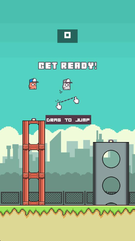 1、游戏开始后依据DRAG TO JUMP的提示,拖动蓝色帽子角色蓄力,调整跳跃方向与力度,筹备跨越障碍。