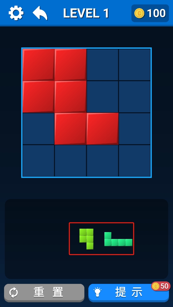 2、拖动下方绿色T形和青色长条形状,放置到上方网格的空白处,与红色方块配合填满整个区域。
