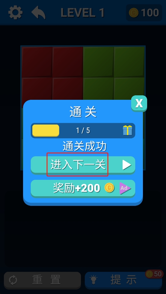3、拼接完成后界面会显示通关成功,点击屏幕中间的进入下一关按钮,继续挑战更复杂的方块拼接任务。