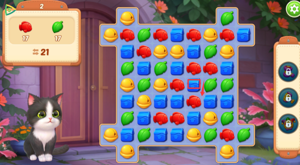 1、传统三消机制优化升级,加入猫咪互动元素,消除过程中会有猫咪在旁边玩耍,成功通关可获得专属奖励用于照顾宠物。