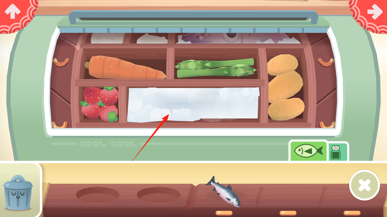 2、在食材冰柜界面,点击冰块区域,探索隐藏食材或触发互动,利用冰柜机制,发现制作寿司的原料,通过点击操作,收集食材,为后续制作做准备,体验食材探索的玩法。