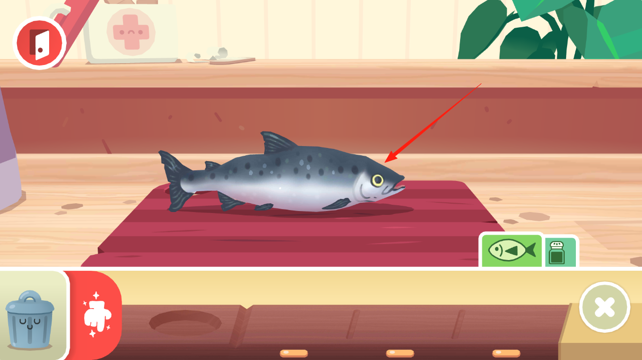 3、将鱼放置砧板后,点击鱼头部位,触发切割或处理互动,开启寿司制作步骤,通过操作,改变食材形态,体验从原料到制作的转化,感受烹饪互动的细节乐趣。