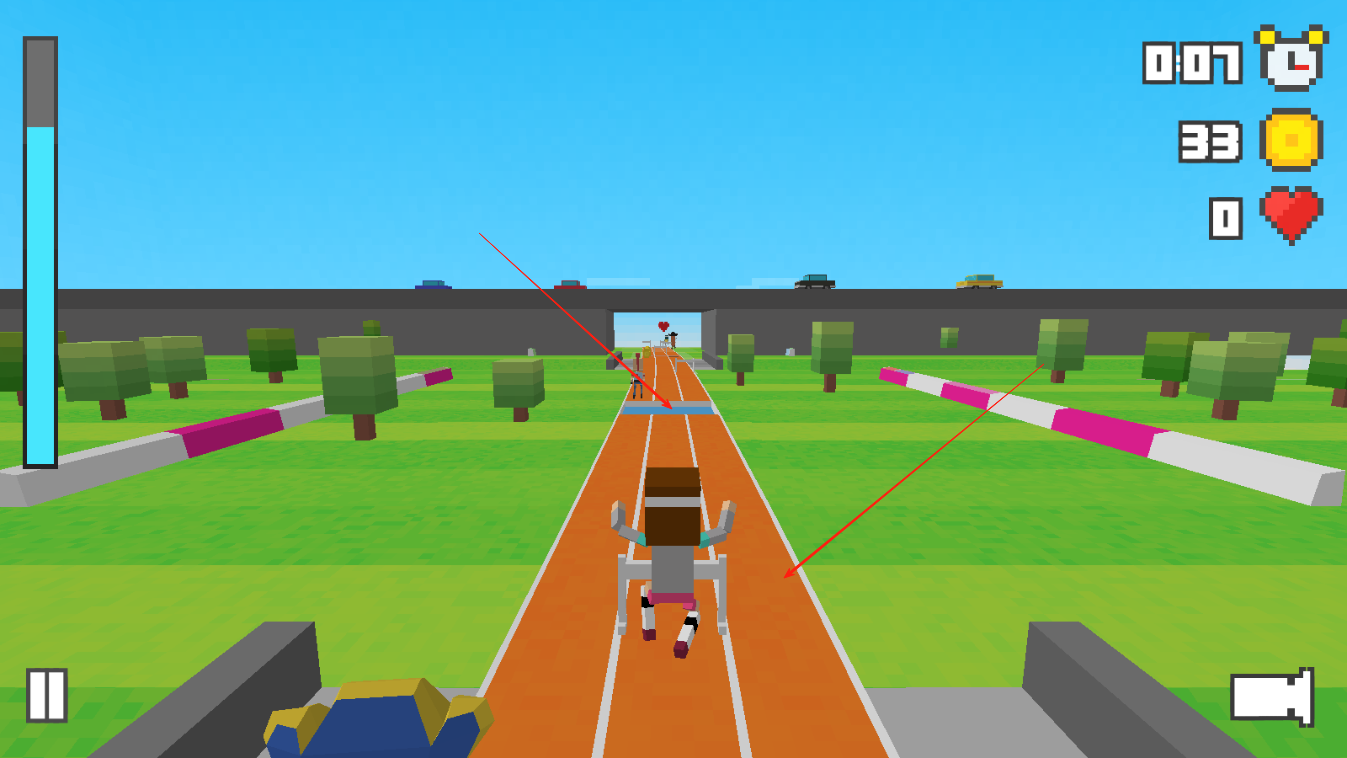 1、游戏开始后小人会奔跑在跑道上,向上滑动小人就会跳跃而起,越过栏杆,若遇到河道越过即可。
