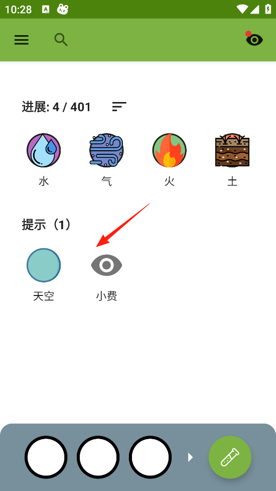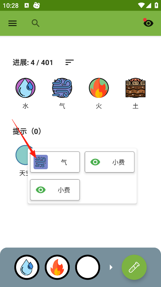 1、进入游戏元素合成界面,查看提示栏的天空与小费图标,点击图标,尝试组合元素,借助提示引导机制,探索合成可能,通过操作,推进元素收集进度,感受解谜的基础乐趣。