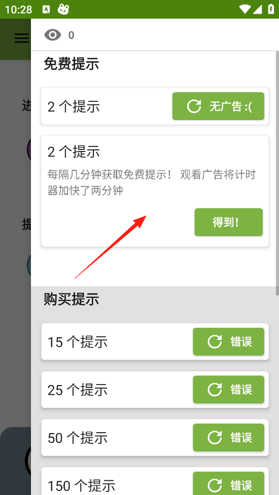 3、进入提示获取界面,看到免费提示规则,点击得到,观看广告或等待获取提示,辅助元素合成,通过操作,获取解谜线索,体验资源获取与策略运用的结合乐趣。