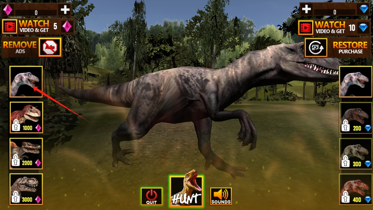 2、在恐龙选择界面,选解锁的恐龙如左侧箭头指向,配置狩猎装备,点击选择恐龙角色。