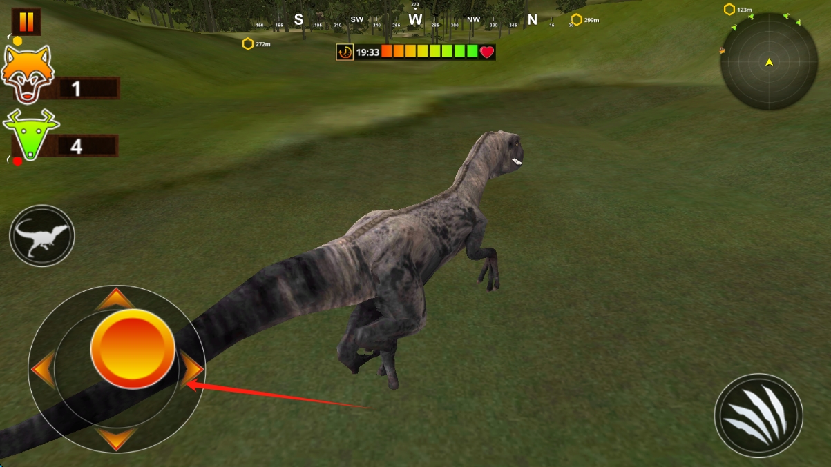 3、进入狩猎场景,用虚拟摇杆移动追踪恐龙,找时机攻击,完成狩猎目标,解锁新恐龙,拨动轮盘移动。