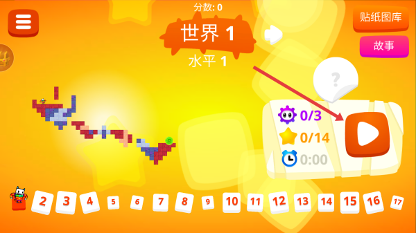 1、选世界1-水平1,点播放键进关卡,控制猫角色冒险。