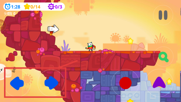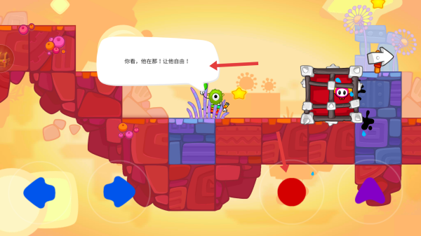 2、用虚拟按键左右、跳跃等操作,收集星星、解救被困角色。