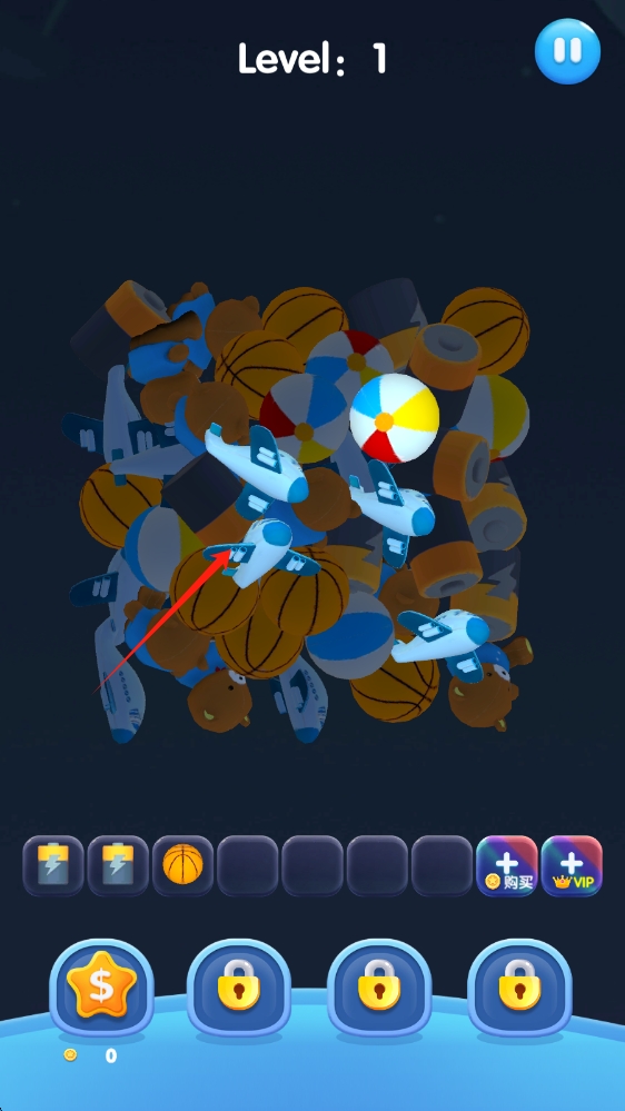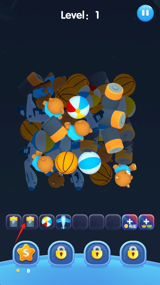 3、利用下方道具如闪电 ,快速清理难消除玩具,完成Level 1,解锁新关卡与玩具,三个消除相同。