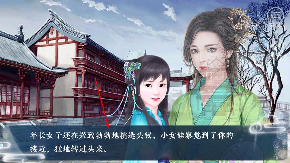 2、在剧情场景,跟随文字指引如女子挑选头钗、小女娃反应等情节,沉浸体验故事发展。