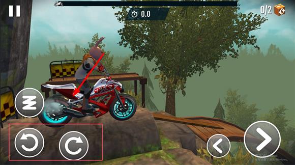 2、选定关卡后,按住屏幕右下角按键控制车辆移动,左下角按钮可前后微调,遇障碍点击左侧跳跃按钮,同时展示特技动作加分。