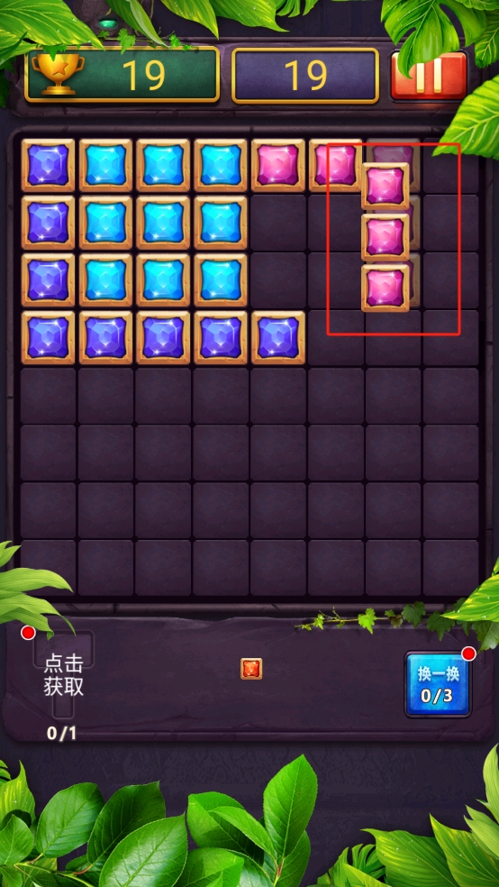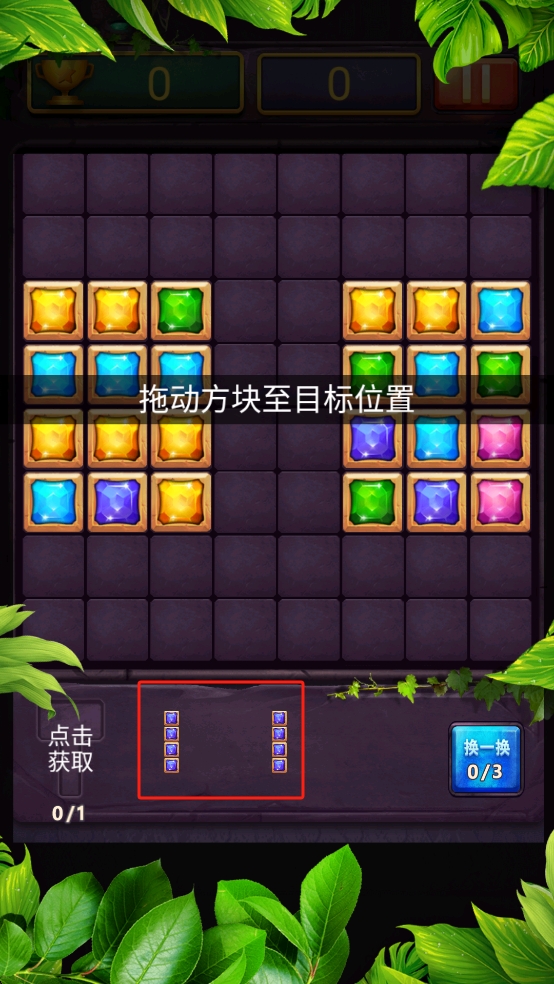 1、第一步拖动下方红色框内的紫色方块,放置到棋盘的空缺位置,为后续同色宝石连线消除做准备。
