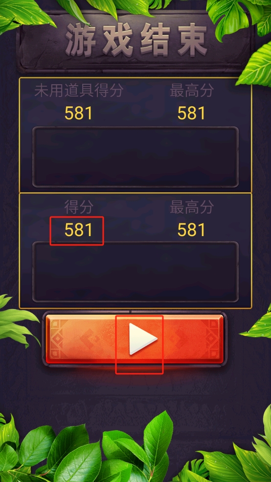 3、游戏结束后界面会显示本局的分数,点击下方红色箭头形状的按钮,重新开始游戏或进入结算后续流程。