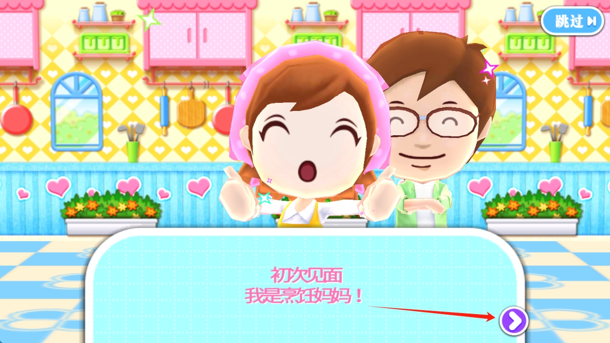 2、跟随烹饪妈妈指引,点击箭头完成新手教学,了解操作,点击按钮下一步操作。