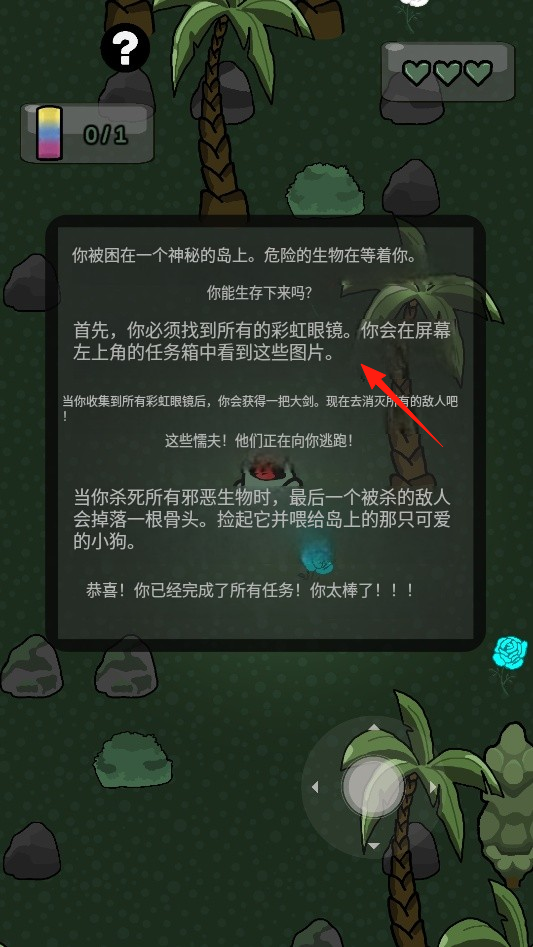 2、在说明界面,阅读任务指引,了解收集彩虹眼镜、消灭敌人等目标,利用任务提示机制,明确行动方向,通过阅读,规划冒险路径,体验剧情驱动的玩法,感受目标探索的互动。