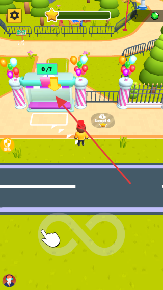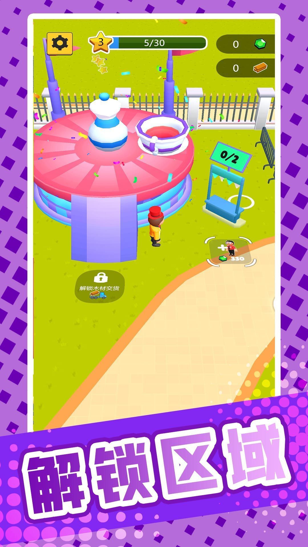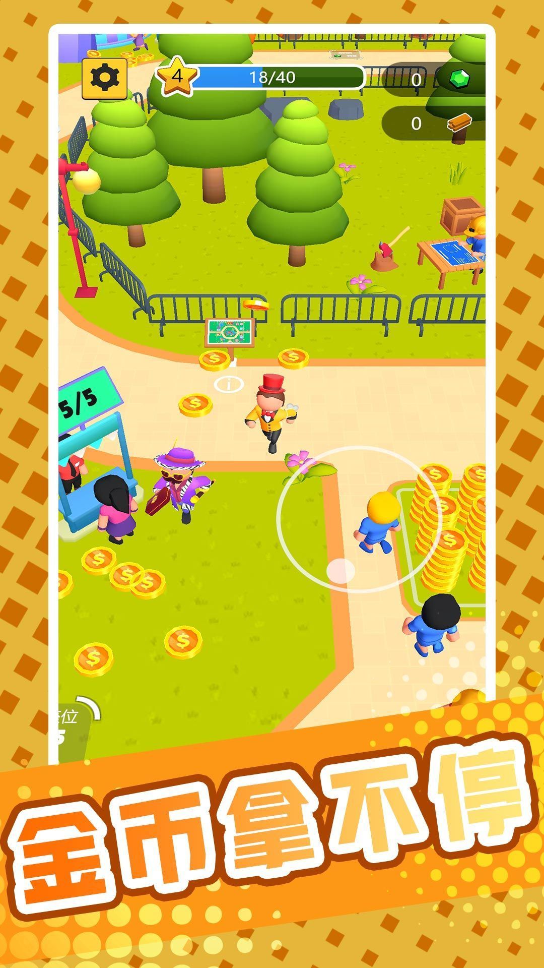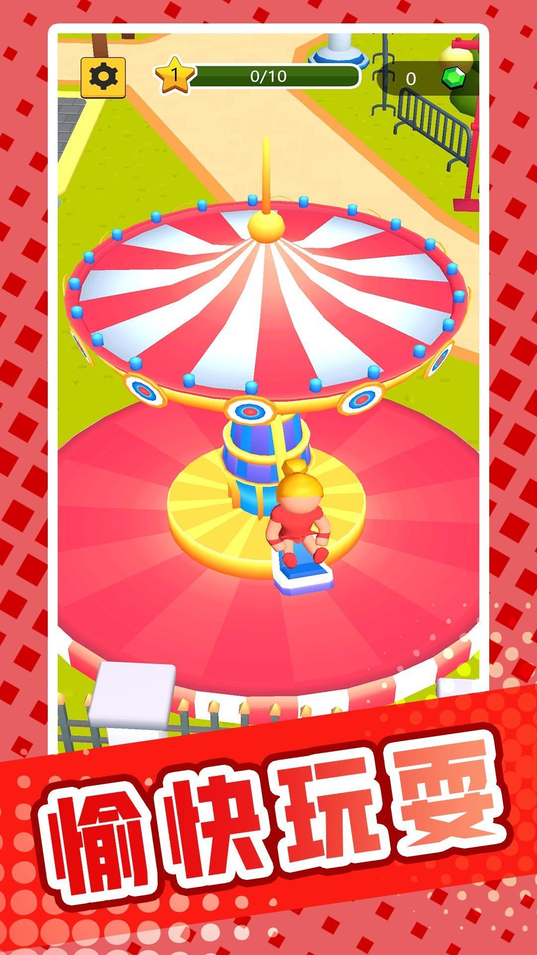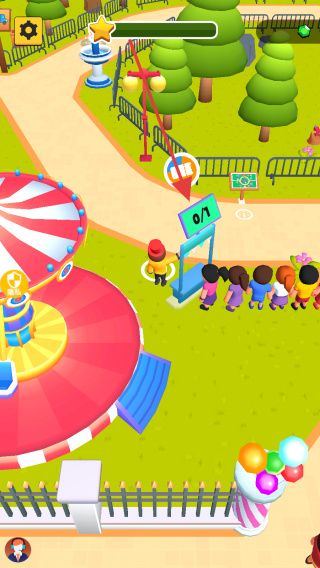 2、在游乐园场景,按提示操作,如点击标有0/1的指示牌,引导游客进行游乐项目,提升游乐园运营效率。