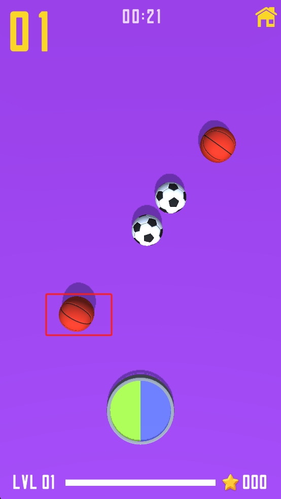 1、进入关卡01中,观察底部半圆区域,操控其对准黑白足球,利用吸附机制收集足球,避开红色篮球,积累星星推进关卡。