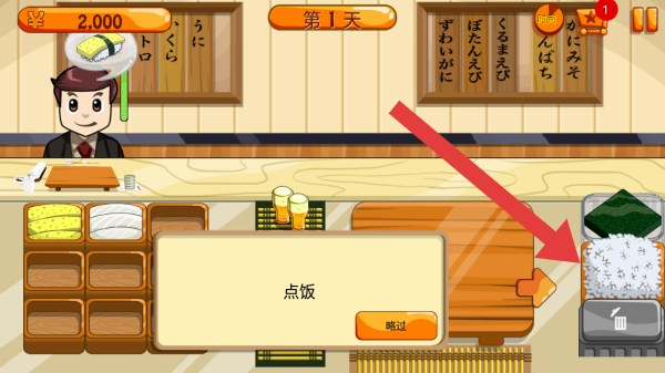 2、第1天经营进度,根据点饭的操作提示及略过按钮,还有寿司店的食材米饭、海苔等,日文菜单装饰,呈现模拟经营寿司店的进程。