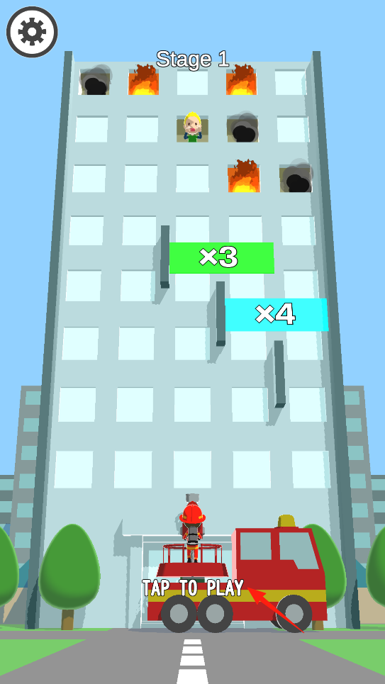 1、进入游戏场景,看到火灾大楼与消防车,点击TAP TO PLAY,启动救援行动,借助点击开始机制,操控消防员展开营救,通过操作,规划救援路径,感受模拟救火的初始互动。