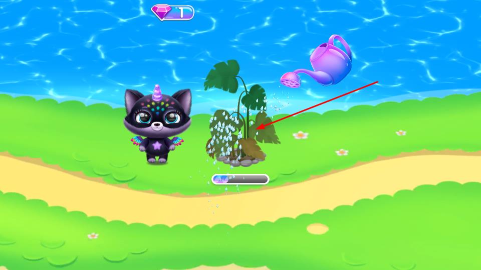 2、操控萌宠进行种植,点击水壶为植物浇水,助力植物生长,在田园互动里收获培育乐趣。