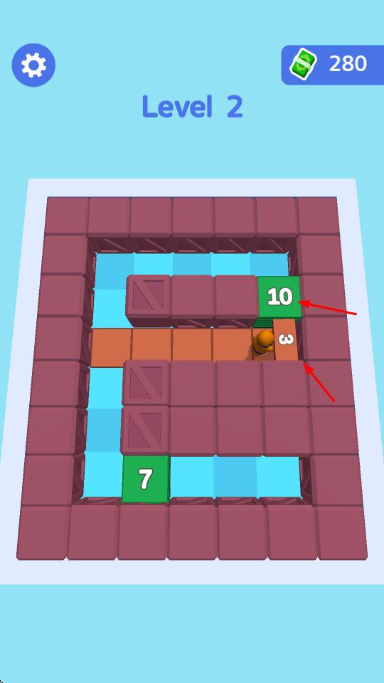 2、根据红色箭头提示,改变角色移动方向,收集标有数字的方块,这些数字可能代表分数或其他游戏元素。