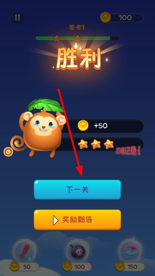 3、完成当前关卡消除任务,显示“胜利”界面,获得金币奖励,点击“下一关”按钮,挑战更复杂的图案矩阵。