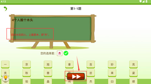 3、选择红框杰字答案,点击对勾确认答案正确。