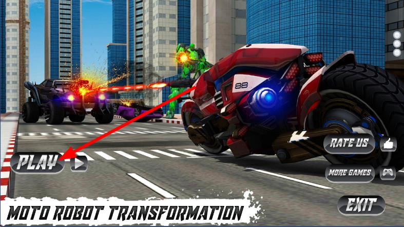 1、点击PLAY按钮,进入MOTO ROBOT TRANSFORMATION游戏,开启机甲摩托战斗冒险。