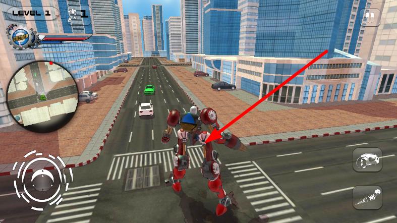 2、操控箭头指向的机甲,在城市道路移动,留意小地图,躲避车辆、准备应对敌人。