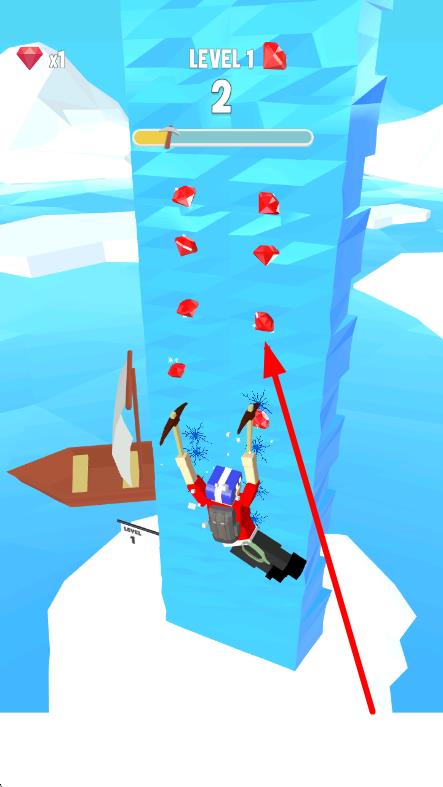 2、点击屏幕让角色挥动冰镐,瞄准箭头指向的钻石,精准落脚,持续向上攀登,避开空隙。