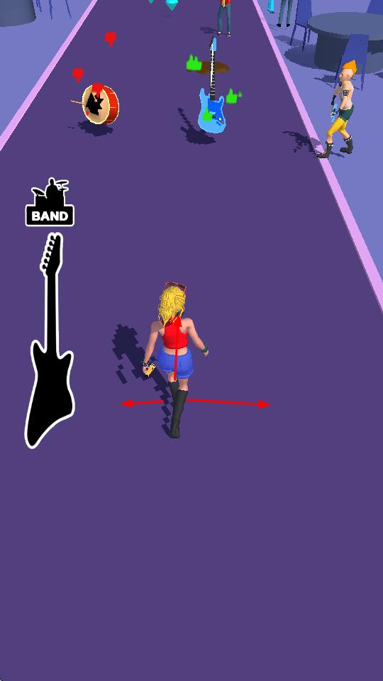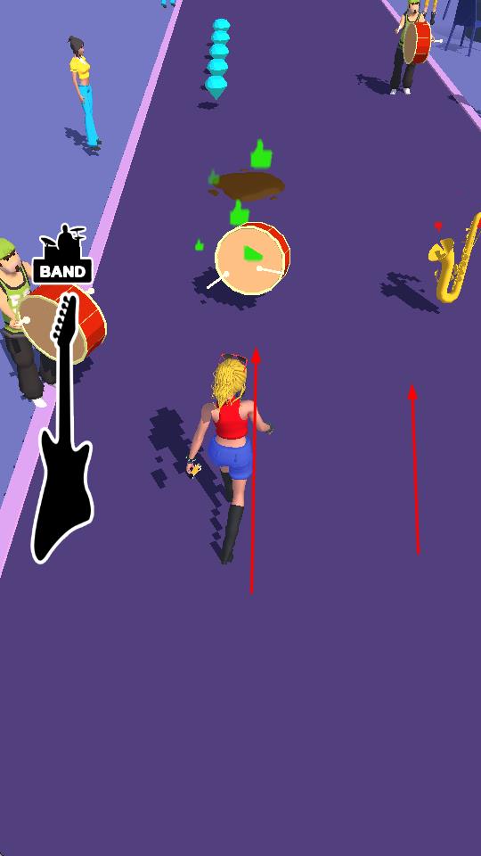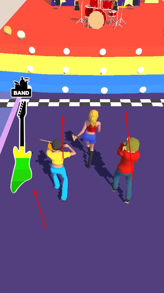 2、根据红色箭头提示,改变角色移动方向,收集各种乐器如吉他、鼓、萨克斯和其他乐队成员,提升乐队的规模和实力。