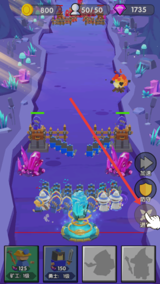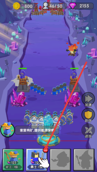 1、战斗时点击下方勇士卡牌,将其部署到战场,配合矿工等单位推进,应对关卡敌人与障碍。