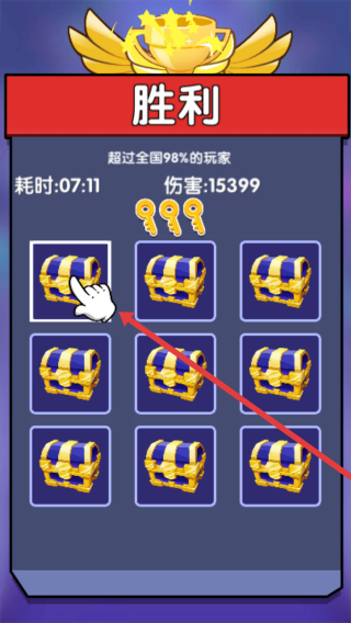 3、在胜利后在奖励界面,可以点击指定宝箱开启,获取关卡奖励,继续挑战后续更高难度关卡。